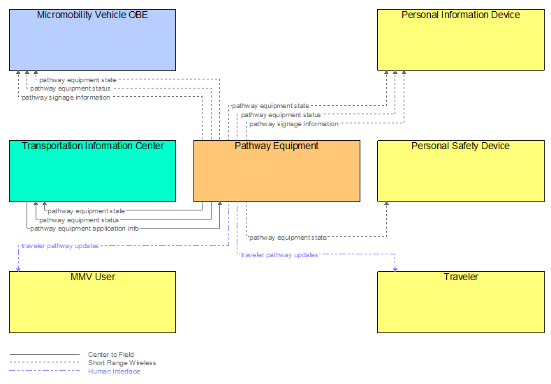 'Pathway Equipment' represents the equipment that is distributed along pathways that monitors and supports movement on the pathways and interfaces with electronic devices used by travelers on the pathways. This physical object includes elevators, escalators, electronic turnstiles, pedestrian (and other VRU) detectors, electronic signage, electronic waypoints, and warning systems for pathway users.